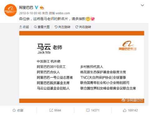 數起2019年的高光時間,55歲的馬云在2019年9月10日高調“退休”一定榜上有名。這件事他已醞釀已久,早在整整一年前,就興致勃勃地更新了自己的名片——以后,不再有“馬云爸爸”,但有了一位鄉村教師代言人、一個公益志愿者,一個關心自然環境保護、脫貧、青年創業和其他公益事業的原企業家。