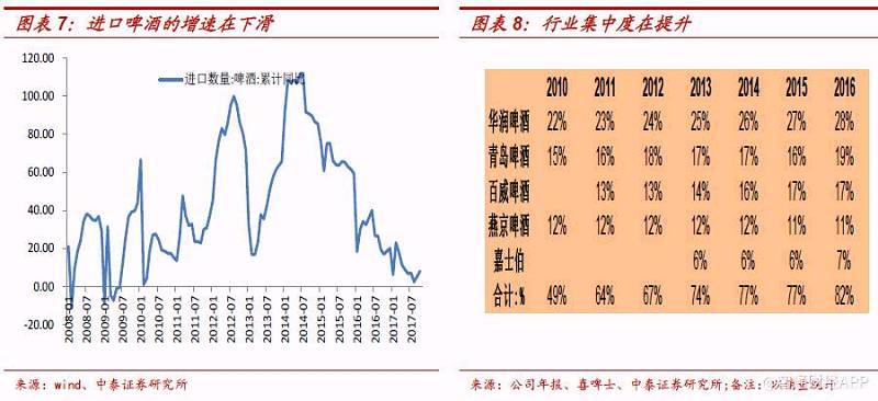 (5)進口啤酒對國內(nèi)啤酒的沖擊是否會變大?中泰證券認(rèn)為,進口啤酒種類多,運輸成本高,國內(nèi)缺乏渠道去運作,沒必要太擔(dān)心。以數(shù)據(jù)為證:其一進口啤酒目前近70萬噸,占比不到2%,低基數(shù)的產(chǎn)品增速在往下。2015年進口啤酒增速近80%,2016年為20%,2017年前三季度增速近8%,增速環(huán)比下行;其二國內(nèi)龍頭企業(yè)的市場份額在加速集中,華潤、青島、百威等市場份額不降反增。