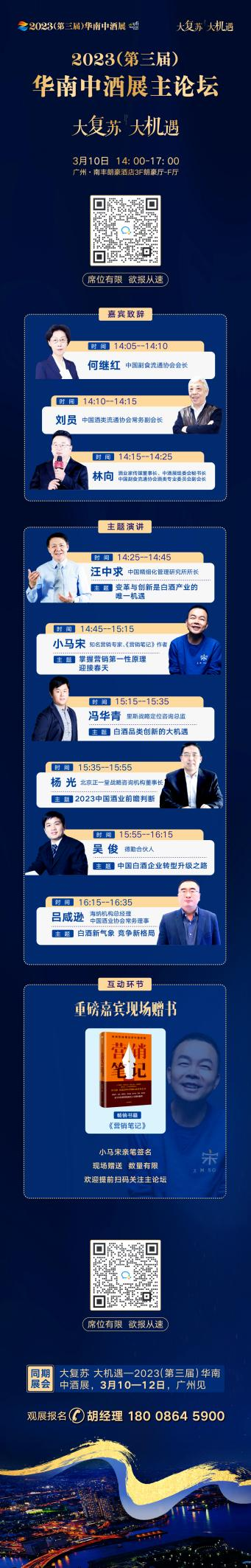 3月10日,2023(第三屆)華南中酒展主論壇現場,知名營銷專家、《營銷筆記》作者小馬宋,將幫助酒業市場營銷相關從業者,掌握營銷精髓,迎接“春天”;茅臺精細化管理首席顧問,為習酒、釣魚臺酒業、李渡酒業等多家知名酒企提供過管理咨詢服務,中國精細化管理研究所所長汪中求,將系統講述《變革和創新是白酒產業的唯一機遇》;里斯戰略定位咨詢總監馮華青及其團隊,曾服務過茅臺股份、貴州習酒等品牌,打造了多個中國商業史上經典案例,屆時,他將結合自身經驗,系統剖析《白酒品類創新的大機遇》;德勤合伙人吳俊,也將結合其20余年的行業經驗,帶來他對“中國白酒企業轉型升級之路”的新思考。