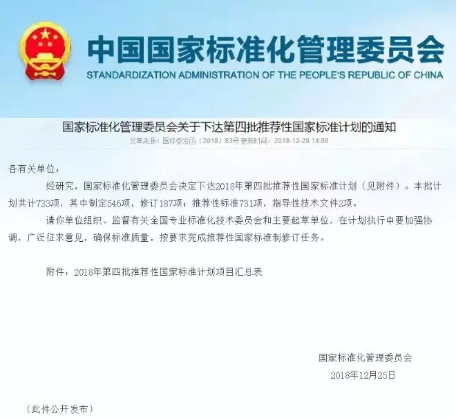 2018年12月25日,國家標準委下達2018年第四批推薦性國家標準計劃(國標委發函[2018]83號),其中包括由全國白酒標準化技術委員會歸口的《馥郁香型白酒》國家標準制定計劃,計劃編號為20184342-T-607,該標準計劃由中糧集團酒鬼酒股份有限公司、中國食品發酵工業研究院等負責起草。