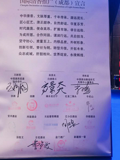 兩個企業家對話完畢之后,汾酒、江小白、勁酒、中國酒業流通協會等企業和機構,一同簽署了“國際清香推廣(成都)宣言”,決定一同推動清香酒的市場開拓。汾酒和江小白的握手,也意味著清香企業在推廣清香酒的消費與文化方面,已經有了共同的實質性動作。