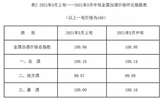 據全國白酒價格調查資料顯示,2021年3月中旬全國白酒商品批發價格定基總指數為107.06,上漲7.06%。其中,名酒價格指數為108.88,上漲8.88%;地方酒價格指數為104.24,上漲4.24%;基酒價格指數為106.91,上漲6.91%。(見表1)