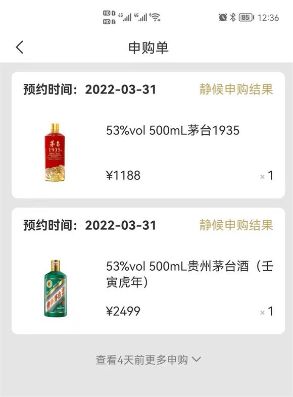 按照申購預約流程,每天上午9:00-10:00開始受理預約,申購的產品包括53度500ml貴州茅臺酒(壬寅虎年)、53度500ml茅臺1935、53 度 375ml*2(壬寅虎年)、53 度 500ml 貴州茅臺酒(珍品)。申購完成后,18時將會產生今日預約申購結果。屆時,用戶收到短信提示后,即可按照平臺規則付款提貨。