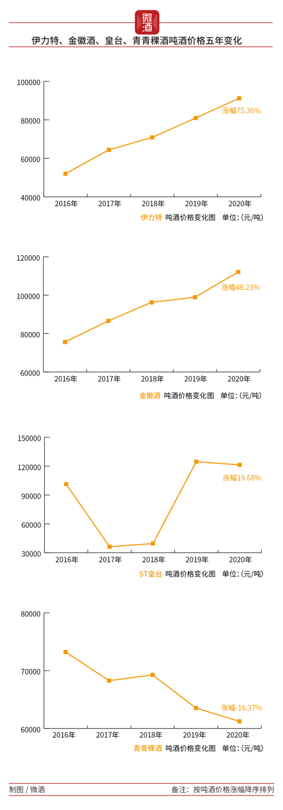 產(chǎn)品升級方面,伊力特的噸酒價格從2016年的5.2萬元上漲至2020年的9.12萬元;金徽酒的噸酒價格從2016年的7.56萬元上漲至2020年的11.21萬元。