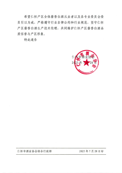 這是6月央視曝光后,仁懷整治醬酒亂象的延續。一周前,仁懷酒協常務副會長焦林強調:“全體會員須以敬畏之心守護品質,協會將配合監管部門堅決清理害群之馬,捍衛產區聲譽。”