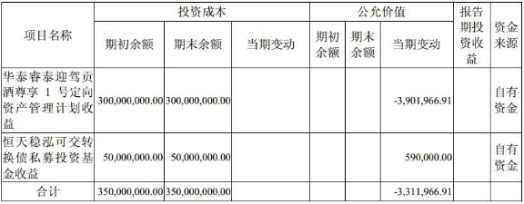 中國經濟網記者查看半年報中上半年迎駕貢酒的投資成績單,發現,上半年,公司3億元投資華泰睿泰迎駕貢酒尊享 1 號定向資產管理計劃收益,這一投資公允價值減少了390萬;迎駕貢酒5000萬元投的恒天穩泓可交轉換債私募投資基金收益公允價值增加了59萬。兩項3.5億元的投資合計公允價值減少了331萬元。