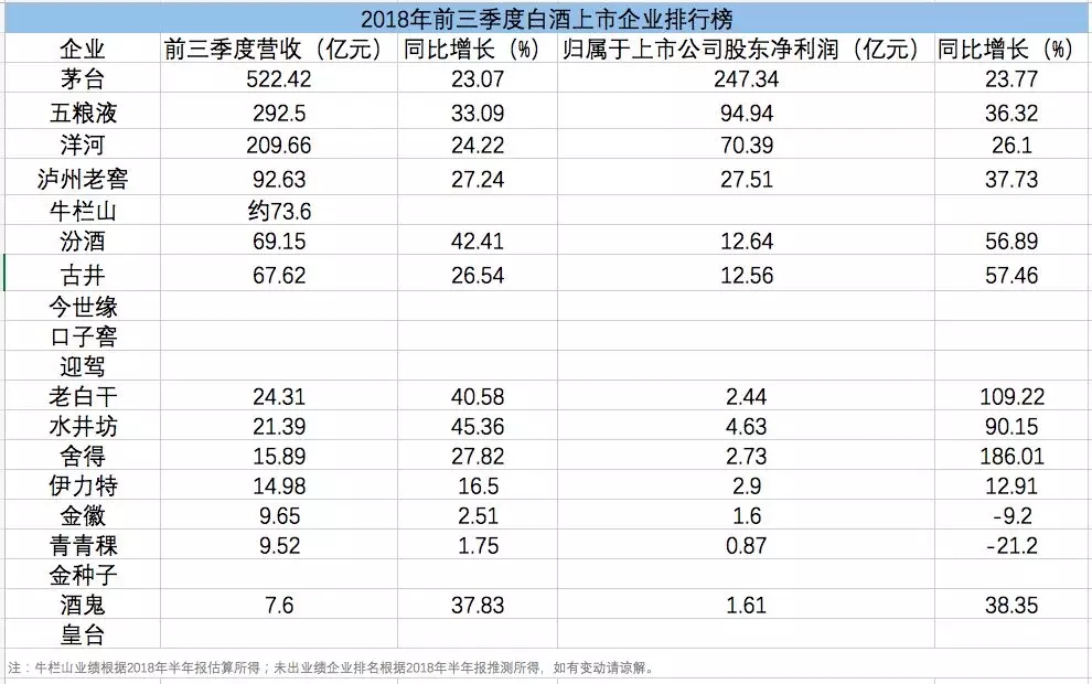 10月28日下午,備受關(guān)注的茅臺、五糧液、瀘州老窖發(fā)布2018年第三季度業(yè)績報告。伴隨著三家業(yè)績報告出爐,白酒上市公司排位也基本確定。