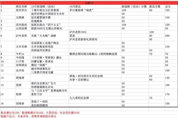 10月,瀘州老窖憑借其“大光瓶戰(zhàn)略”和兩大核心單品“黑蓋”和“1952”的驚艷亮相,奪得10月創(chuàng)新排行榜第一。郎酒通過與“人民文學(xué)”簽署戰(zhàn)略合作協(xié)議、成功舉辦重陽下沙大典,位列榜單第二位。酒鬼酒糖酒會期間兩大單品同樣值得關(guān)注。