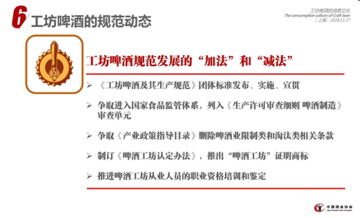此次論壇上,中國酒業協會常務副秘書長兼啤酒分會秘書長何勇就工坊啤酒的消費文化進行了深入淺出的剖析,得到了現場觀眾的高度認同。他指出,中國酒業協會長期致力于建立工坊啤酒業的規范化,并積極在相關政策法規中為工坊啤酒爭取最大的產業發展支持和合法地位。這也就是在不斷完善行業規范的基礎上,對工坊啤酒業的規范發展進行“加法”和“減法”的修正。如制定、發布、實施和宣貫《工坊啤酒及其生產規范》團體標準;推薦工坊啤酒納入國家食品監管體系;爭取工坊啤酒生產許可審查細則審查單元;建議《產業政策指導目錄》刪除啤酒業限制類和淘汰類相關條款;制訂《啤酒工坊認定辦法》,推出“啤酒工坊”證明商標;推進啤酒工坊從業人員的職業資格培訓和鑒定等措施,以政策法規為指導基礎,以優勝劣汰為工作原則,大力推進工坊啤酒產業發展,為中國啤酒行業提供新的增長點。