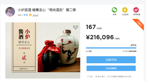 當前,隨著營銷模式的多元化,眾籌成為一種受關注度很高的營銷方式。日前,一款名為小爐作坊的醬酒就在眾籌網上開啟了第二季眾籌,短短7個小時便實現了眾籌目標,并且得到了投資圈大佬董寶珍的力挺。小爐醬酒作為一個新興品牌,在知名度不高、品牌溢價能力不強的背景下,為何得到酒友和投資人的追捧呢?