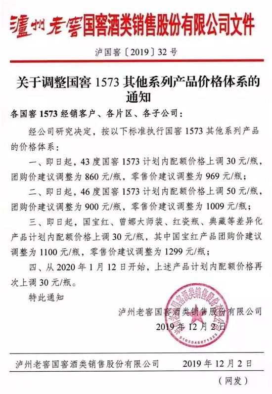 瀘州老窖再次宣布提價,不過這次是對國窖1573其他系列產品進行提價。12月2日,瀘州老窖向其經銷商下發《關于調整國窖1573其他系列產品價格體系的通知》。通知顯示,國窖1375其他系列產品在配額價、團購價、零售價等方面均作了調整,其提價幅度為30元、50元不等。