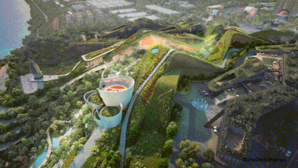 如何讓消費(fèi)者沉浸在酒業(yè)美好空間?奧雷·舍人選擇借助科技力量。“五糧·東方酒谷”的蜿蜒形態(tài),將促進(jìn)空氣流動(dòng),大大提升自然通風(fēng)和熱舒適性,并通過(guò)規(guī)劃水道和水景的蒸發(fā)冷卻進(jìn)一步提升舒適度;人造竹林的有棚連廊,可以為身在其中的人們提供有效的遮陽(yáng)和主要交通空間,瓶狀挑空和可開啟天窗則增強(qiáng)了穿過(guò)建筑半室外空間的空氣流動(dòng),從而在炎熱潮濕的季節(jié)形成舒適的小氣候,同時(shí)實(shí)現(xiàn)節(jié)能;綠化屋面與太陽(yáng)能板相結(jié)合,充分利用高低起伏的屋面來(lái)生產(chǎn)能源和保持水份。