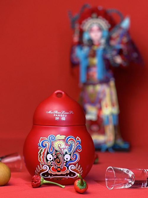 而福祿門神酒的瓶型設計同樣巧妙,瓶型選用葫蘆造型,整體圓潤大方、憨態可掬,同時既融合了龍鳳版馬勺的小孔設計,也將胖福“體態豐盈”的富貴美感發揮了淋漓盡致。整體來看,福祿門神酒富態豐盈的葫蘆造型更添“福祿”之美意,同時搭配通體純正的中國紅色調,熱情奔放、喜慶祥瑞氣氛,天然讓人與之親近。
