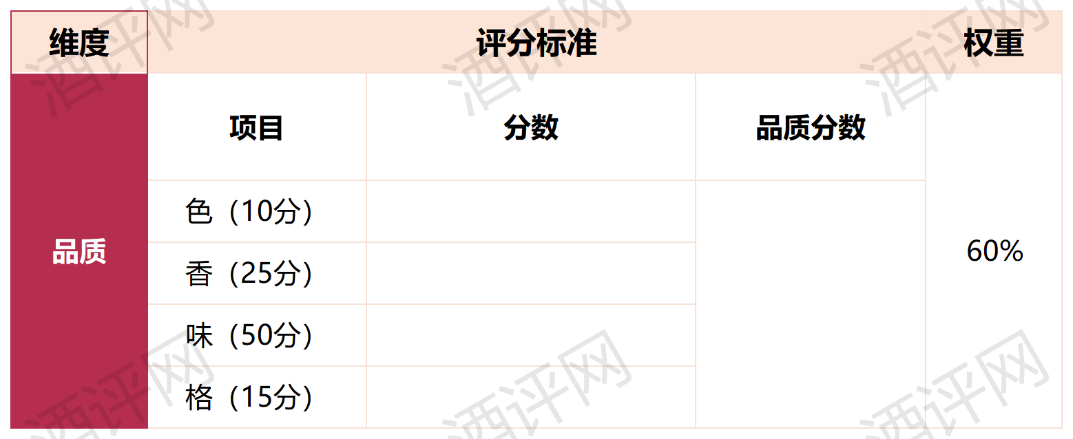 毋庸置疑,白酒消費兼具“面子消費”和“里子消費”,除了酒質,白酒的品牌、包裝、上市時間、性價比等方面也是影響消費者認可度的重要因素。因此,我們對白酒的測評也需要在這些維度做出評定,再結合不同指標的不同權重,最終得出綜合評分。