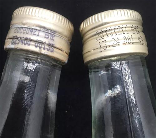 真酒頂蓋圖形顏色鮮亮字體規(guī)整,假酒顏色明顯淺了很多細節(jié)不清晰(上真下假)。