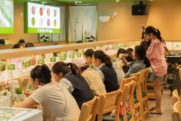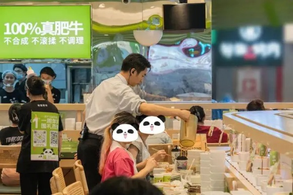 雖然說餐飲業(yè)用熊貓做IP的品牌并不少見,但是一圍把熊貓這個視覺符號用到了極致:門口粉色腮紅的熊貓立牌、熊貓慕斯蛋糕、服務員帽子上趴著個小熊貓、各種熊貓周邊……甚至連裝香油的瓶子都是熊貓樣式。