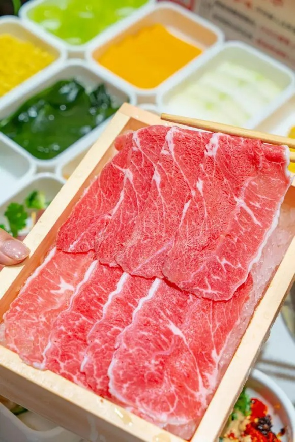 而且不同于很多火鍋店的肥牛是“卷”,一圍的肥牛是進口凍鮮牛肉,一整塊牛肉在門店現(xiàn)點現(xiàn)切,一片片擺在盤子里的,鮮紅的紋理,非常新鮮,價值感很高。