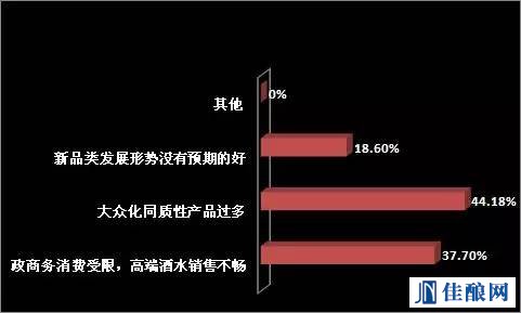 在經銷商分析的“客觀因素”中,經銷商普遍認為“大眾化同質性產品過多”是造成庫存壓力大的最主要因素,這一原因占比超44.18%過了,在大眾酒時代來臨時,多數經銷商也做了“大眾化”的調整:一些中高端產品價格下調,經銷商也補充了部分中檔價位產品,大眾價位產品擁擠,消費者選擇過多,這導致大眾價位產品以及主打商務消費的中高端產品的積壓,從而造成高庫存。在調查中,仍有超過33.70%的經銷商認為,“政商務消費受限,高端酒銷售不暢”是導致當前酒業消費形勢劇變及動銷困難的最主要原因。此外,不少經銷商表示,大環境的變化也是導致高庫存的客觀因素之一。首先,目前整體經濟形勢低迷,消費者購買力下降,而產品供應過剩,造成供大于需,使得產品動銷困難;其次,社會上提倡理性飲酒,加大了對酒駕等行為的查處力度,而工薪階層的購車量在增加,這一部分人嚴格遵守“開車不喝酒”,以往的喝酒風氣有所衰退,這從婚宴用酒量的減少上可見一斑。
