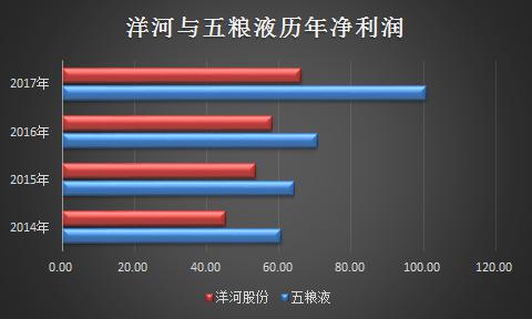 2017年洋河實現營業收入199.18億元,是五糧液的66%;實現凈利潤66.27億,也是五糧液的66%。而在這前,洋河的凈利潤一度占到過五糧液凈利潤的84%。