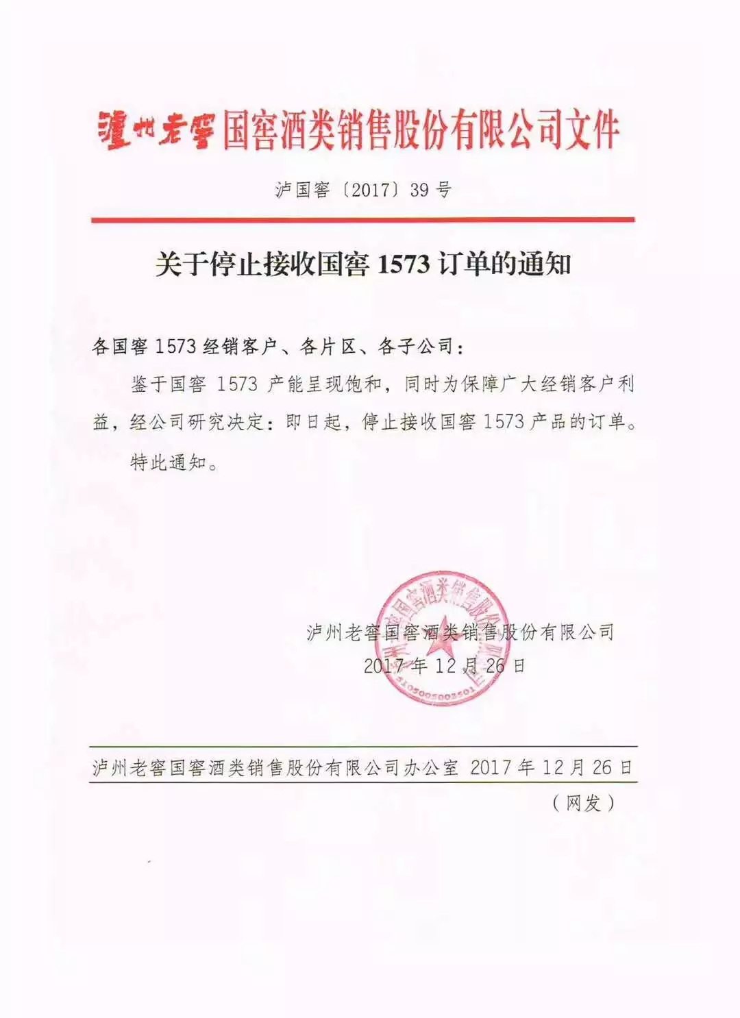 12月26日,糖酒快訊獲悉瀘州老窖國窖酒類銷售股份有限公司針對各國窖1573經銷客戶、各片區和各子公司下發了《關于停止國窖1573訂單的通知》。通知指出,即日起,停止接收國窖1573產品的訂單。