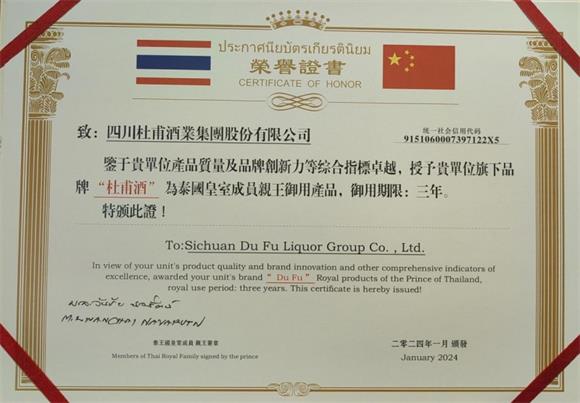 2024年1月份剛過,杜甫酒業就連續獲得兩項國際殊榮:一是被泰國皇室成員旺猜親王授予“泰國皇室成員親王御用產品”榮譽;二是榮登“馬達加斯加共和國駐華大使館推薦用品”之列。這兩次榮耀的加冕,無疑將杜甫酒的品牌影響力與文化傳播力推向了新的高峰。