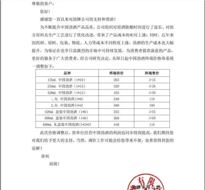 通知要求,125mL35度中國勁酒流通渠道售價不得低于15元/瓶,258mL35度中國勁酒流通渠道售價不得低于28元/瓶,520mL35度中國勁酒流通渠道售價不得低于50元/瓶,520mL35度盒裝中國勁酒流通渠道售價不得低于55元/瓶。