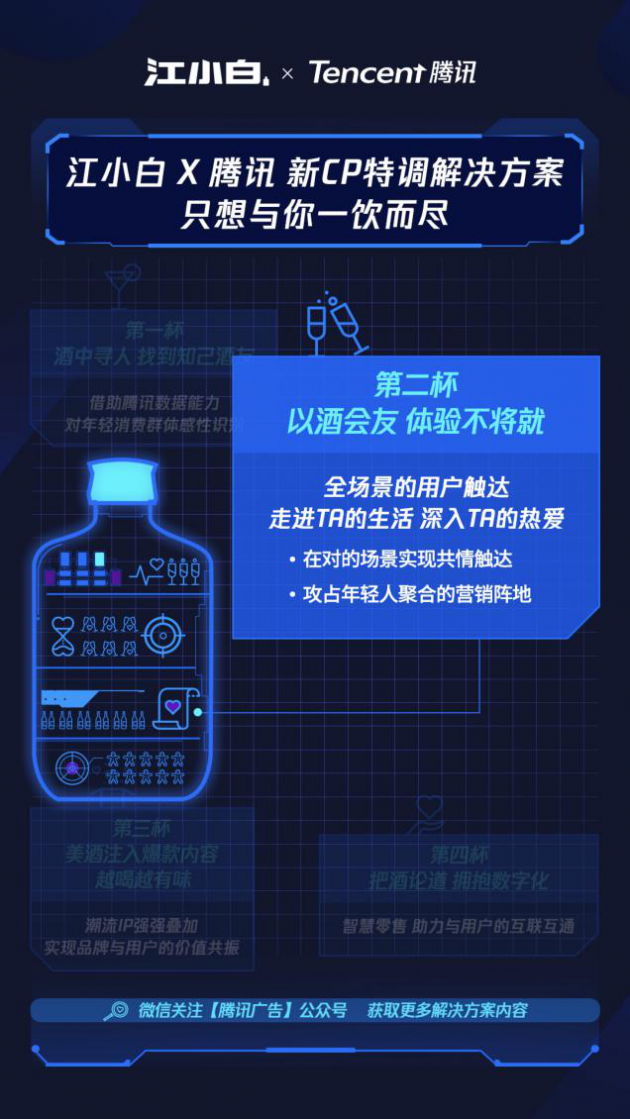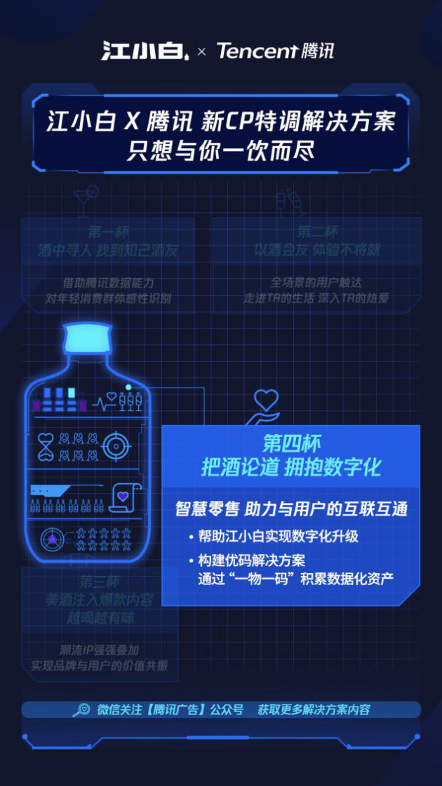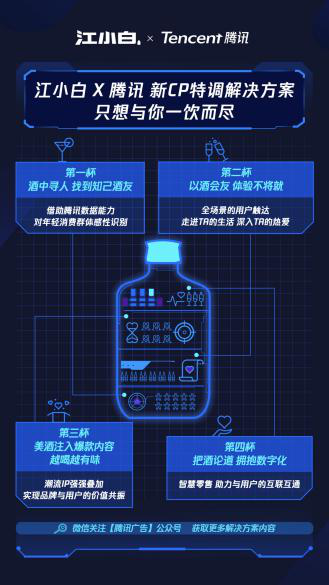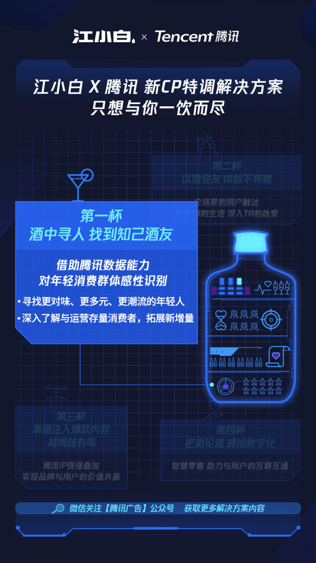 此次騰訊與江小白的強強聯手,將從數據洞察、用戶場景、內容共建、智慧零售四大方面打造白酒行業解決方案,助力江小白新酒飲時代的數字化升級和潮流營銷。下面,帶大家共飲四杯,品嘗江小白與騰訊“新CP解決方案特調”。