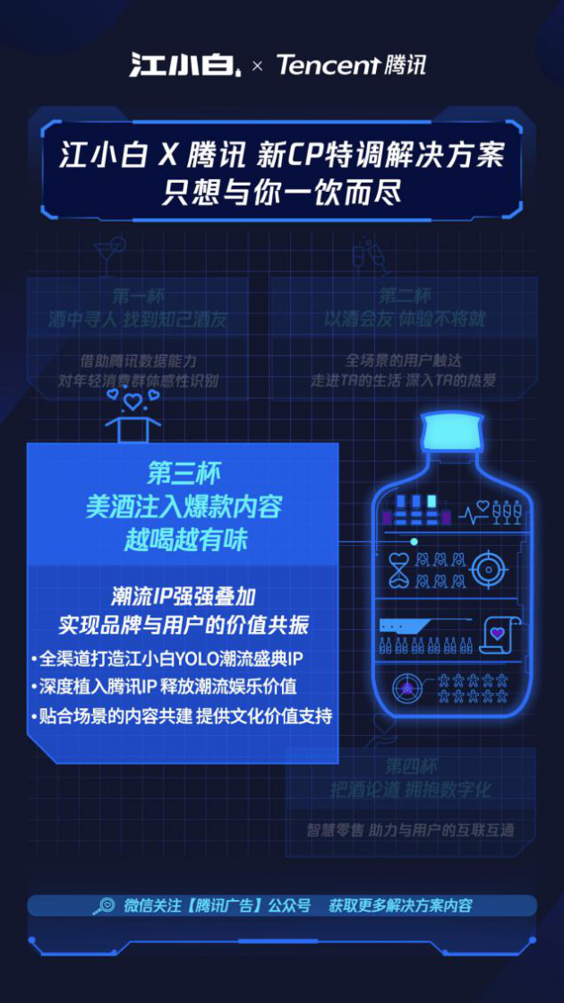 酒過四杯,干了騰訊與江小白“新CP解決方案特調”,把握新酒飲時代的先機,打通從用戶心智到數字化的高架橋,搭上這班通往用戶感知到潮流營銷的快車,期待新酒飲時代下的白酒行業的數字化新征途。