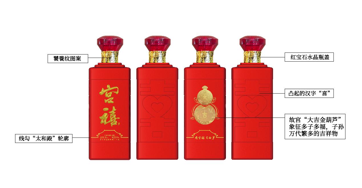 宮禧·喜事連連酒將象征吉慶喜慶的“喜”、“大吉金葫蘆”、“龍鳳和璽彩畫(huà)”等圖案作為產(chǎn)品設(shè)計(jì)元素,結(jié)合現(xiàn)代審美,創(chuàng)造性融入宮廷皇家建筑元素,既具有皇家吉慶文化特點(diǎn),又具有生活吉慶之美。 同時(shí),宮禧酒·喜事連連產(chǎn)品傳達(dá)了“多子多福,子孫繁盛” 的福、祿、壽、喜的美好祝福與連綿不斷的美好未來(lái)。
