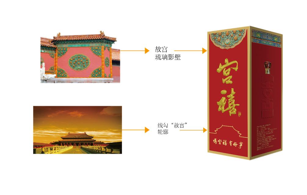 宮禧·喜事連連酒包裝盒正面設(shè)計(jì)采用紫禁城乾清門(mén)琉璃照壁元素、太和殿建筑輪廓為設(shè)計(jì)元素,傳達(dá)了皇家尊貴與氣派。