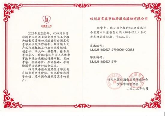 2023年6月,四川中國白酒金三角酒業(yè)協(xié)會(huì)公布首屆四川濃香型白酒名優(yōu)老窖池(40年以上)認(rèn)定結(jié)果。其中,敘府有853口老窖池成功獲得【首屆四川濃香型白酒名優(yōu)老窖池】認(rèn)定。敘府作為濃香型白酒產(chǎn)業(yè)的品質(zhì)守護(hù)者,承載活態(tài)白酒文化遺產(chǎn),以守護(hù)“活態(tài)瑰寶為己任,潛心鉆研,為白酒釀造文化的存續(xù)貢獻(xiàn)敘府力量。