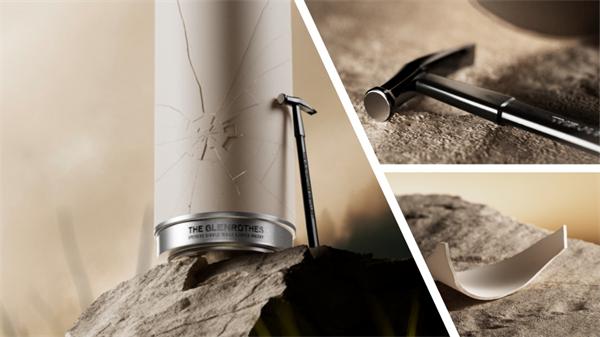 格蘭路思51年以顛覆性的“破繭”設計,重新定義威士忌的開啟儀式。酒瓶密封于特制環(huán)保復合材料Jesmonite(天然礦物粉與水性樹脂復合物)制成的圓柱形外包裝中,藏家需使用附贈定制工具破除外殼,方能見證杰作真容。這一“破繭”儀式,既是對探索精神的呼應,亦是對“蛻變”的詮釋:破碎的外殼并非終結,而是新生的起點。