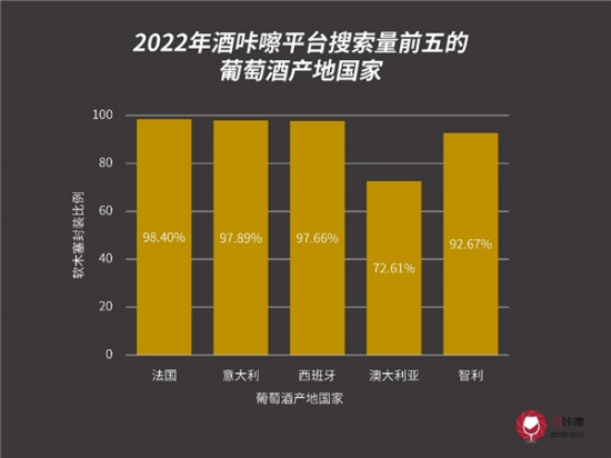 近十多年來,全球每年生產的葡萄酒中約有70%使用軟木塞封瓶。另外,根據一項有關2021年中國暢銷葡萄酒百強的調研結果顯示,其中有95款使用軟木塞封裝。而酒咔嚓提供的最新統計數據對此更是錦上添花,在其已增添了“開瓶方式”的6萬多款葡萄酒中,高達95%的酒款使用軟木塞作為封瓶材料。此外,2022年酒咔嚓平臺搜索量前五的葡萄酒產地國家中,其中四個國家的90%以上的酒款使用了軟木塞封瓶: