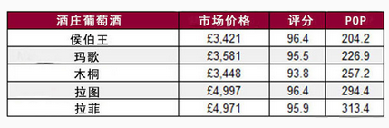 以下表格則顯示,侯伯王和拉圖(Chateau Latour)均有最高的平均分 96.4(近 10 個物理年份的葡萄酒)。然而,拉圖最近的市場價是 5 個一級莊中最高的,達 4,997 英鎊/箱。此外,侯伯王的 POP 值最低,說明它的性價比最高。
