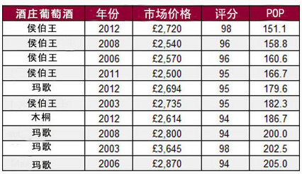 在 POP 值最低(最具性價比)的 10 款年份酒中(如下圖),侯伯王占 5 款,瑪歌占 4款,木桐占 1 款。前 5 中,侯伯王占 4 款,POP 值最低的是侯伯王 2012 年份酒。而 POP 值最高的是拉圖 2010 年份酒,POP 值達到 430。可見,侯伯王雖價格見漲,但其性價比相對是最高的。那么,它會成為下一個占據市場優勢的一級莊嗎?我們拭目以待。(來源/紅酒百科全書,文/Liv-ex)
