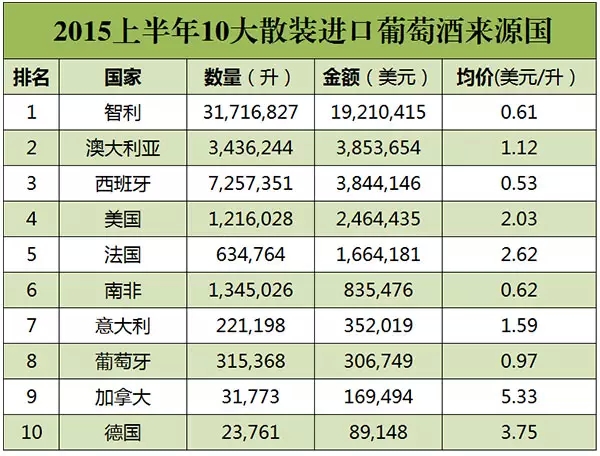2015 上半年,散裝葡萄酒進(jìn)口量為 46,321,417 升,同比上漲 41.65%;進(jìn)口額為 32,891,255美元,同比上漲 8.94%;平均價(jià)格為 0.71 美元/升,同比下跌 22.82%。由此,可以看出散裝葡萄酒進(jìn)口量相比去年同期大幅上漲,而均價(jià)卻呈較大幅度的下跌態(tài)勢(shì)。