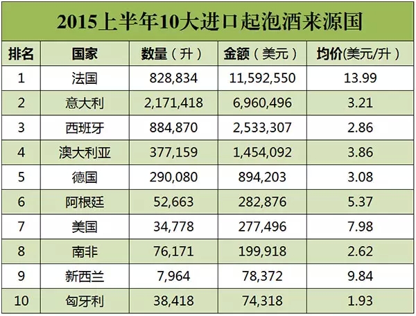 2015 上半年,我國(guó)進(jìn)口起泡酒總量為 4,857,009 升,同比下降 14.09%;進(jìn)口總額為24,595,860 美元,同比下降 33.58%;均價(jià)為 5.06 美元/升,同比下降 22.75%。起泡酒呈現(xiàn)出了下跌態(tài)勢(shì)。