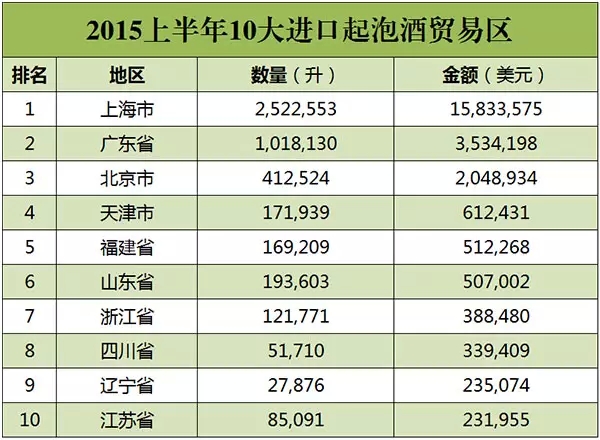 從貿(mào)易區(qū)域來(lái)看,上海市是絕對(duì)的起泡酒貿(mào)易地,占了進(jìn)口起泡酒一半以上的市場(chǎng)份額。