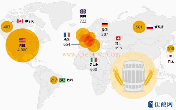 全球其他地區與北美地區精釀啤酒熱潮的規模相比究竟如何?奧特克公司還研究了全球各地的精釀啤酒商數量,發現歐洲擁有的精釀啤酒商實際上比美國還多出三家?傮w而言,歐洲有4,486家精釀啤酒商,從國家來看,英國在歐洲排名首位,擁有723家精釀啤酒商,法國排名第二位,擁有654家。而意大利擁有600家精釀啤酒商,在歐洲排名第三位。全球范圍內的精釀啤酒商現已超過1萬家,其中86%都分布在北美地區和歐洲。