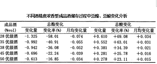 根據(jù)著名白酒專家、沱牌總工程師李家民2008年發(fā)表于釀酒科技雜志的文章,《濃香型白酒貯存過程中總酯、總酸的變化規(guī)律》的研究結(jié)果顯示:濃香型白酒貯存過程中,酒精度越低,總酯減少量越多,總酸增加量越多,變化速度越快;酒精度越高,總酯減少量越少,總酸增加量越少,變化速度越慢。同一酒精度的品質(zhì)高的白酒總酯減少量、總酸增加量高于低檔白酒。