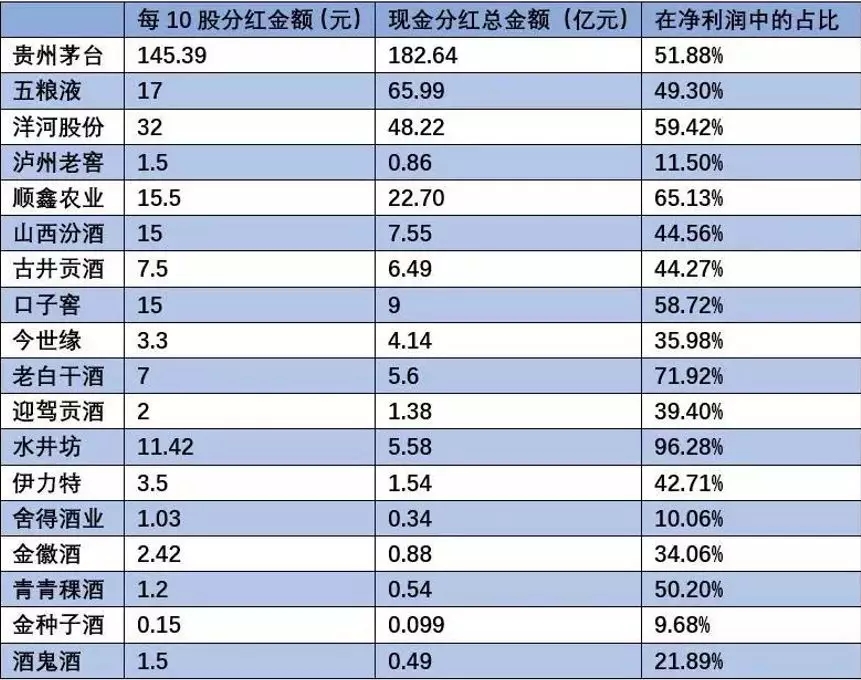 18家酒類上市公司的分紅及所占利潤對比表(數據來源:2018年各公司年報)